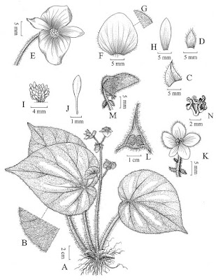 | FIGURE 1. Begonia zhongyangiana W.G.Wang et S.Z.Zhang. A. Habit; B. Hairs and margin of the adaxially leaf; C. Stipule; D. Bract; E. Staminate flower; F&G. Outer tepal of the staminate flower; H. Inner tepal of the staminate flower; I. Androecium; J. Anthers; K. Pistillate flower; L. Cross-section of ovary; M. Capsule. N. Side view of stigmas.