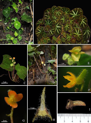 | FIGURE 2. Begonia zhongyangiana W.G.Wang et S.Z.Zhang. A. Habit; B. Cultivated individuals; C. Blooming individual with short erect stems; D. Adult plant without erect stem; E. Staminate flowers; F. Side view of the pistillate flower; G. Front view of the pistillate flower; H. Cross-section of ovary; I. Capsule.