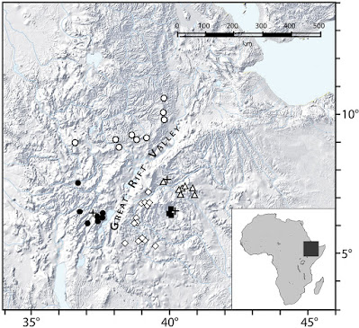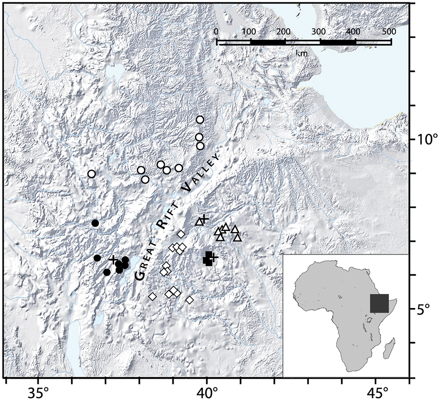 | a map showing the distribution of the Leptopelis gramineus species complex members: L. gramineus (filled circle), L. sp. ‘Shewa’ (empty circle), L. montanus nom. nov. (empty triangle), L. diffidens sp. nov. (filled square), L. sp. ‘Borana/Sidamo’ (empty diamond). Type localities of the described species are marked with a cross. |