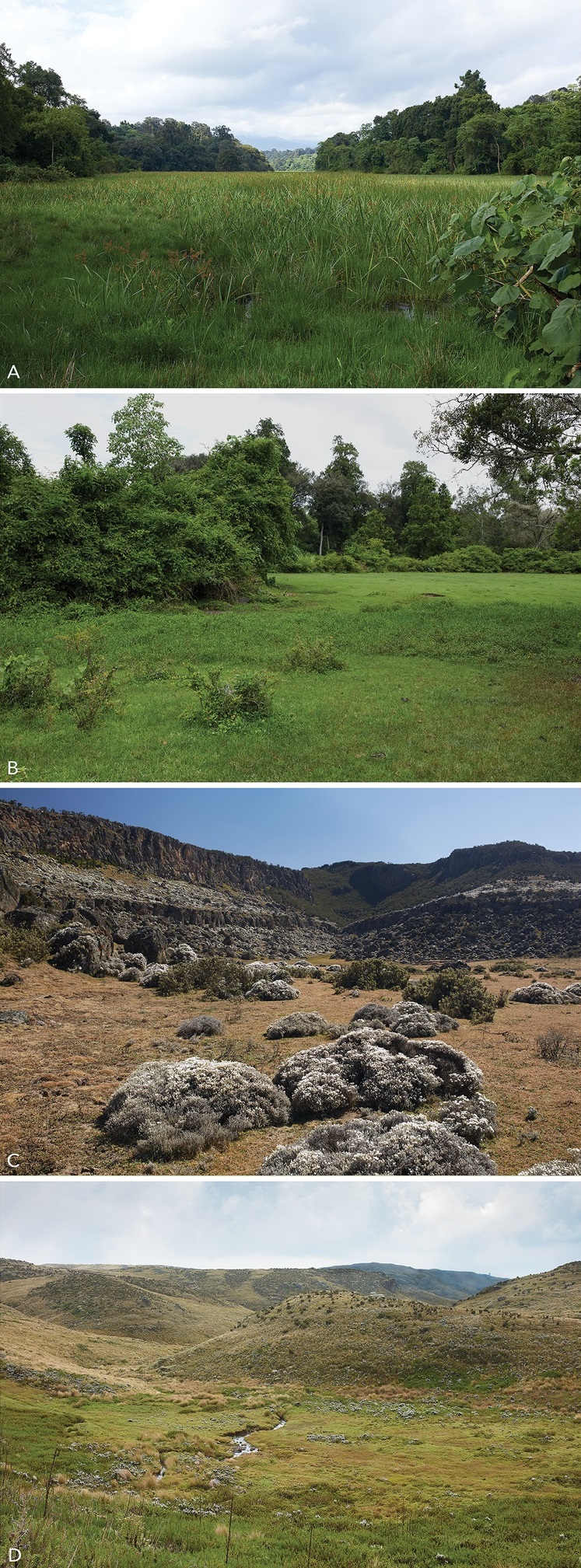 | Figure 10. Habitats of three species of the Leptopelis gramineus complex A, B Habitats of Leptopelis diffidens sp. nov. in the Harenna Forest – Segoba glade and Manyate village C habitat of Leptopelis montanus nom. nov. in the Web Valley, Bale Mountains D habitat of L. sp. ‘Shewa’ in Menz-Guassa. |