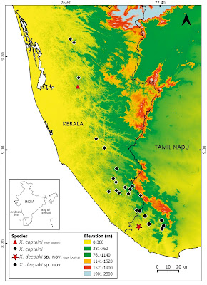 | Figure 2. Distribution of Xylophis captaini and Xylophis deepaki sp. nov. in the Western Ghats based on specimens examined in this study and observations of uncollected animals reported in the text. |
