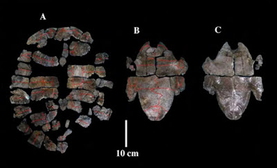 | : Turtle shell of Adocus kohaku sp. nov., holotype, KAM 01. A, carapace in dorsal view; B, plastron in ventral view; C, plastron in dorsal view. Red lines show scute sulci on shell surface. |