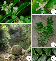| Plate of Elatostema qinzhouense L.F. Fu, A.K. Monro & Y.G. Wei. (A) Habitat; (B) habit; (C) leave base and stipule; (D) staminate inflorescence; (E) staminate flower; (F) pistillate inflorescence.