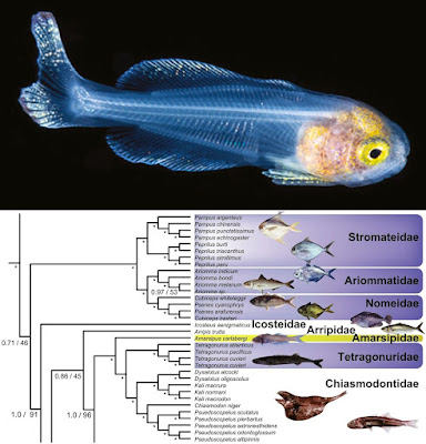 Richard C. Harrington, Matt Friedman, Masaki Miya, Thomas J. Near and Matthew A. Campbell. 2021. Phylogenomic Resolution of the Monotypic and Enigmatic Amarsipus, the Bagless Glassfish (Teleostei, Amarsipidae). Zoologica Scripta. DOI: 10.1111/zsc.12477