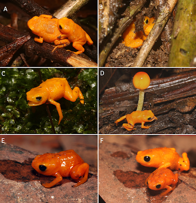 | Natural history observations of Brachycephalus rotenbergae sp. nov. (A) Inguinal amplexus; (B) An amplected couple of hiding under the juçara palm (E. edulis) root system; (C) Mouth gaping defensive behaviour; (D) One specimen near a yellow/orange mushroom, notice the similarity of color and size; (E) One juvenile specimen; (F) Two juvenile specimens, but the smaller one is darker. |