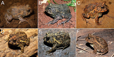 | Coloration patterns and variation in glandular warts from adult males of Odontophrynus reigi in life. (A) Holotype, LGE 19810, (B) paratype, LGE 19878, Candelaria, Misiones, (C) paratype, LGE 19848, Capital, Misiones, (D) paratype, ZUFMS-AMP 09655, Bonito, Mato Grosso do Sul, (E) nontype specimen, LGE 19875, Iguazu, Misiones, and (F) unvouchered specimen, Capital, Misiones. |