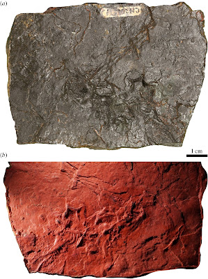 | Figure 3. Carbonodraco lundi gen. et sp. nov., (a) the holotype specimen (CM 23055) (Amy C. Henrici photo) and (b) latex peel of the holotype specimen. |