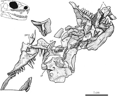 | Figure 4. Illustration of the cranial anatomy of the holotype of Carbonodraco lundi gen. et sp nov. (CM 23055), and a reconstruction. |