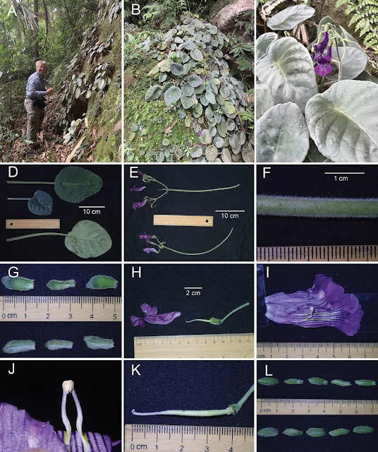 | Figure 2. Chayamaritia vietnamensis F.Wen, T.V.Do, Z.B.Xin & S.Maciej A, B habitat C habit D adaxial (top) and abaxial (bottom) surface of leaf blade E cymes F peduncle G adaxial (top) and abaxial (bottom) surface of bracts H pistil, calyx and lateral view of corolla I opened corolla with stamens and staminodes J stamens with cohering anthers K pistil L adaxial (top) and abaxial (bottom) surface of calyx lobes.