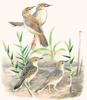 | New species of cisticola warblers from the Kilombero floodplain of Tanzania. At the top, Cisticola bakerorum Kilombero Cisticola (Kidenenda wa Kilombero); at the bottom Cisticola anderseni White-tailed Cisticola (Kidenenda Mkia-mweupe). For both species, the bird in the front is painted after the type specimen, whereas the bird behind is based on photos of birds in more worn plumages. Watercolour painting by Jon Fjeldså. |