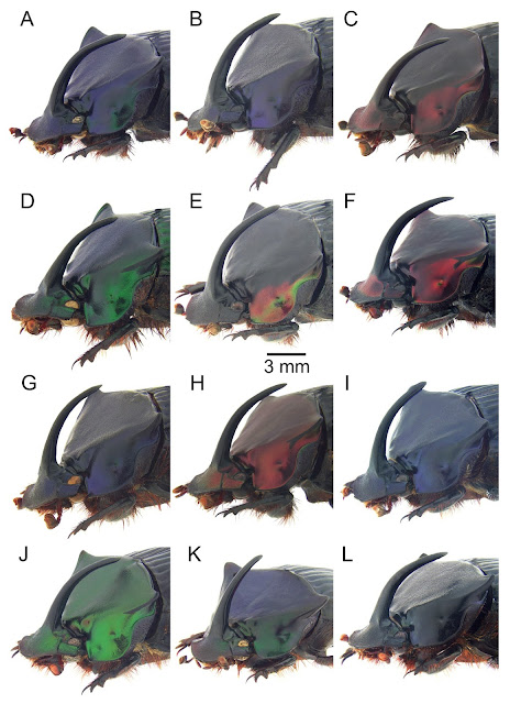 | Lateral view of males within the Phanaeus endymion species group. A. Phanaeus chiapanecus sp. nov. (TAMU). B. Phanaeus endymion Harold, 1863 (VMC). C. Phanaeus funereus Balthasar, 1939 stat. rev. (VMC). D. Phanaeus jackenioi sp. nov. (UVGC). E. Phanaeus malyi Arnaud, 2002 (VMC). F. Phanaeus olsoufieffi Balthasar, 1939 stat. rev. (VMC). G. Phanaeus pacificus sp. nov. (UVGC). H. Phanaeus panamensis sp. nov. (TAMU). I. Phanaeus porioni Arnaud, 2001 stat. rev. (VMC). J. Phanaeus pyrois Bates, 1887, green morph (VMC). K. Phanaeusr zedowskii sp. nov. (TAMU). L. Phanaeus zapotecus Edmonds, 2006 (VMC). |