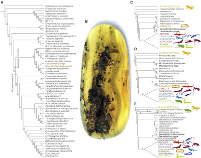 • A new species of the reptile in amber, Oculudentavis, is described • Oculudentavis is a bizarre lizard, not a bird • The bird-like appearance of Oculudentavis is due to convergence in skull proportions