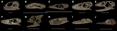 | Figure 4. Cranial disparity of typical lepidosaurs to demonstrate the atypical skulls of Oculudentavis (A) Sphenodon punctatus, Rhynchocephalia UF11978; (B) Anelytropsis papillosus UF-H-86708, Dibamidae; (C) Sphaerodactylus caicosensis UF95971, Gekkota; (D) Smaug swazicus NMB-R9201, Cordyliformes; (E) Eugongylus albofasciolatus CAS159825, Scincidae; (F) Varanus sp. UF71411, Varanidae; (G) Rieppeleon brevicaudatus CAS168891, Iguania; (H) Boaedon fuliginosus CAS85747, Serpentes; (I) Oculudentavis naga GRS-Ref-28627; (J) O. khaungraae HPG-15-3.
