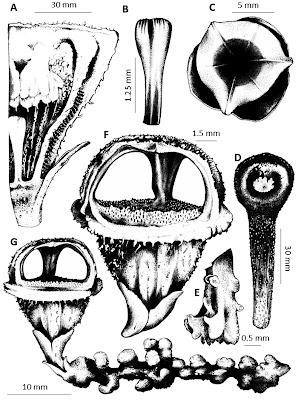| Figure 2. Illustration of Thismia sitimeriamiae Siti-Munirah, Dome & Thorogood A cross section of perianth showing pendulous stamens (above) and slender pistil (beneath) B pistil C aerial view of flower showing mitre and portions of apical part of floral tube and outer tepals D fruit E stamen (showing outer side of connective) F flower, lateral view G habit, showing inflorescence (flower) and roots.