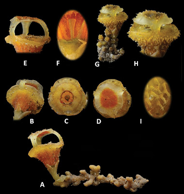 | Figure 3. Thismia sitimeriamiae Siti-Munirah, Dome & Thorogood A habit with roots B flower, view from below C aerial view of floral tube (mitre removed) D flower, aerial view E mitre, lateral view F ovary and pistil, lateral view G flower, lateral view H mitre, lateral view I stellate trichomes on the outer surface of floral tube.