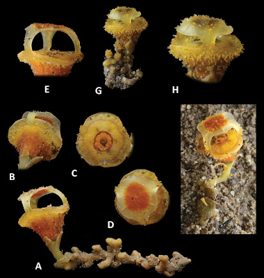 Thismia sitimeriamiae Siti-Munirah, Dome & Thorogood, sp. nov. Diagnosis: Thismia sitimeriamiae has a unique combination of morphological traits, by which it differs from all its congeners including its orange colour, its surface characteristics and its floral architecture: the flower is strigose with pale orange simple and stellate trichomes covering the outer surface of the floral tube, mitre and ovary; the upper surface of the annulus is covered by very short trichomes; the outer tepals are reduced and inconspicuous and the inner tepals are curved upwards, connate, forming an umbrella/parasol-like mitre with a flattish apex.