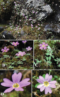 | Primula dujiangyanensis W.B.Ju, Bo Xu & X.F.Gao. A. Habitat; B. plant of pin flower; C. plant of thrum flower; D. pin flower; E. thrum flower. |