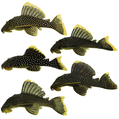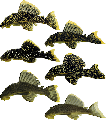 | Fig 1. Different color patterns present in Baryancistrus xanthellus. Photographs of live specimens taken right after collection. Not all color morphs are represented in the figure. |