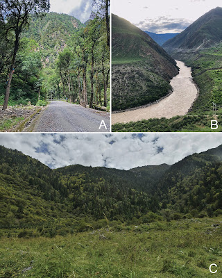 | Figure 7. The habitat of Gloydius lipipengi sp. nov. (A Muza Village, Zaty, Tibet, type locality of G. lipipengi sp. nov. B the landscape of the Nujiang River, 15 km from the type locality) and Gloydius swild sp. nov. (C Heishui, Sichuan) A and B Photographs by Jin-Cheng Liu. |
