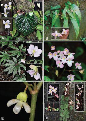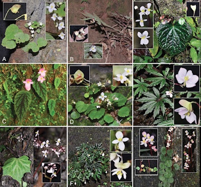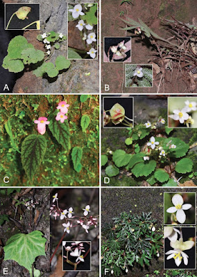 | Begonia glabritepala Souvann. et Lanors.: A – Flowering plant in natural habitat, flowers and capsule. B. heteracantha Souvann. et Lanors.: B – Flowering plant in natural habitat, flower and capsules.