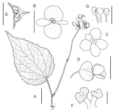 Diagnosis. This new species is similar to B. sinuata Wall. ex Meisn. but differs in single leaf, indumentum of bristle hairs and reddish or bronzy green adaxial leaf surface (vs. two-three leaves, indumentum of stellate hairs and dark green adaxial surface of leaf), three styles (vs. two styles), and glandular hairy pedicels (vs. pedicels with stellate hairs) (Fig. 8, 9A).