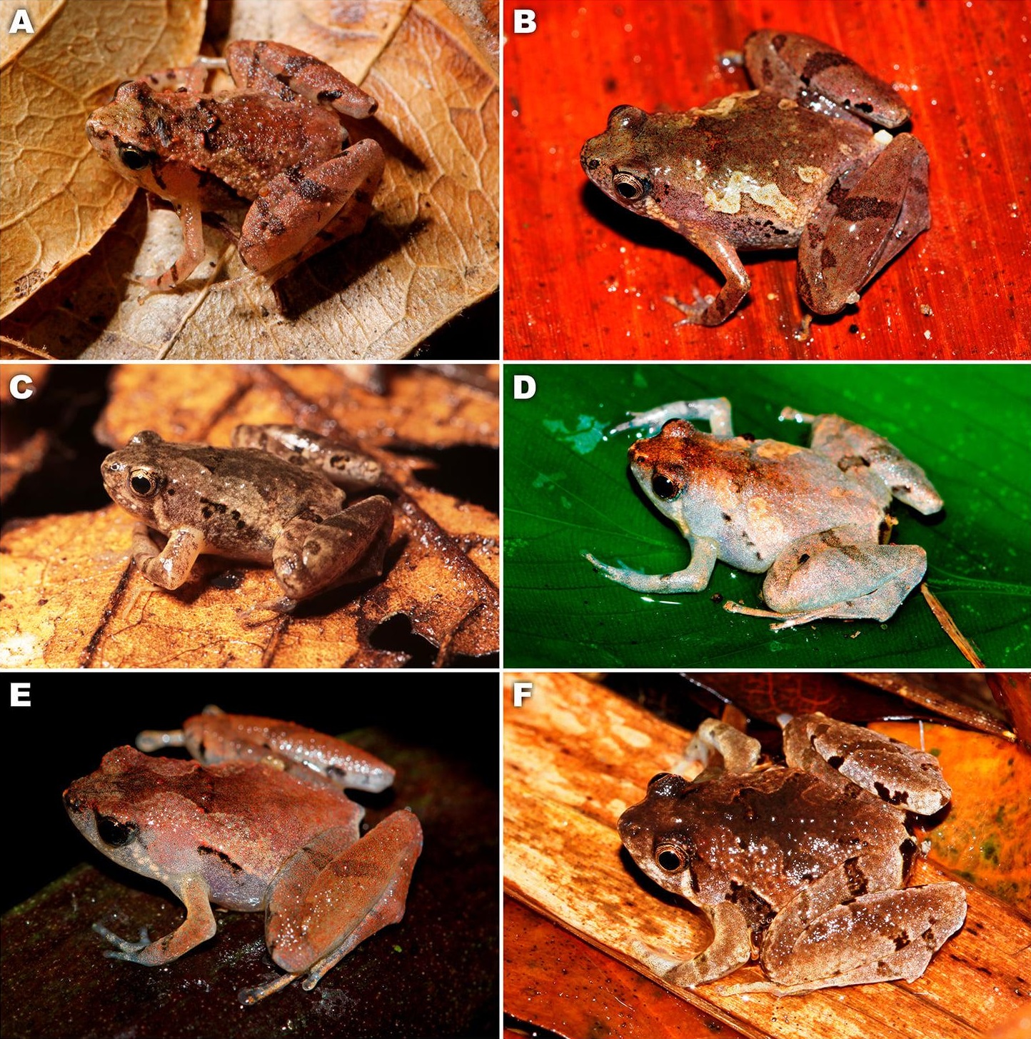 | Variation in colouration of Microhyla tetrix sp. nov. (in situ). (a) Adult female from Ao Nang Dist., Krabi Prov. (not collected); (b) paratype AUP 00601, female from Klong Sok Dist., Surat Thani Prov.; (c) paratype AUP 00605, male from Klong Sok Dist., Surat Thani Prov.; (d) adult female from Wat Tham Sanook, Chumphon Prov. (not collected); (e) paratype ZMMU A6033, female from Klong Sok Dist., Surat Thani Prov.; (f) paratype ZMMU A6035, male from Khao Kra Puk Mt., Phetchaburi Prov.