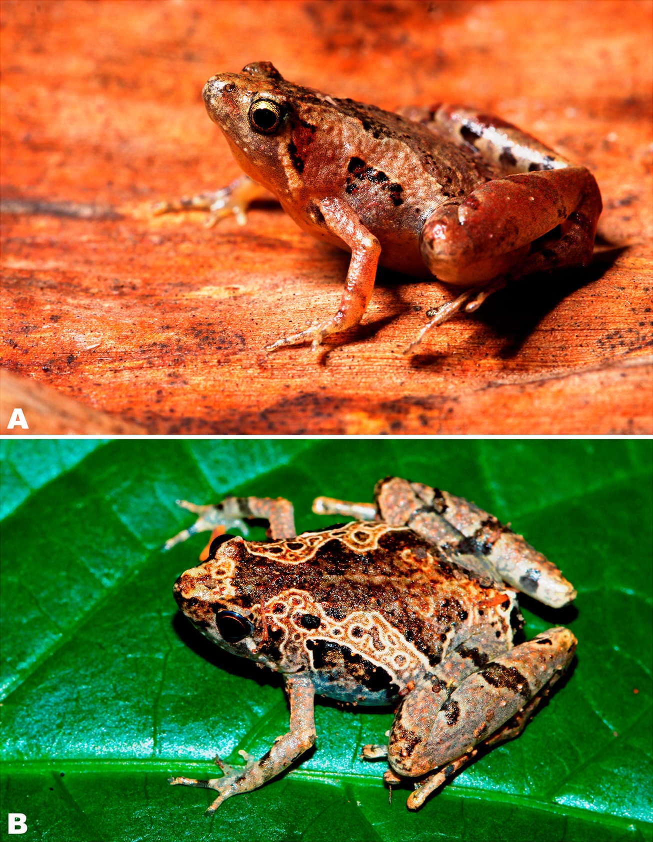 | Microhyla superciliaris Parker from Saba Yoi, Songkhla Prov., Thailand, showing characteristic dorsal colouration and presence of an enlarged superciliary tubercle. (a) Adult male; (b) adult female (not collected).