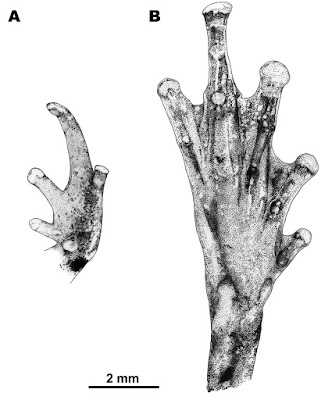 | Figure 6. Morphological details of the male paratype of Microhyla tetrix sp. nov. (ZMMU A6034), male, in preservative. (a) Volar view of the left hand; (b) plantar view of the right foot.
