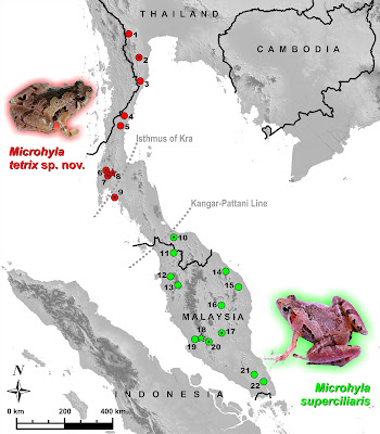 ABSTRACT An integrative taxonomic analysis recovered the new miniaturised species Microhyla tetrix sp. nov. of the M. superciliaris group as the sister species to M. superciliaris. The new species inhabits low-elevation to mid-elevation evergreen tropical forests of Ratchaburi, Phetchaburi, Prachuap Khiri Khan, Chumphon, Surat Thani and Krabi provinces of south-western Thailand. Additionally, our analysis supports the occurrence of M. superciliaris in Songkhla Province of southern Thailand. Our results underscore the important role of the Isthmus of Kra – a well-known biogeographic region of cladogenic turnover – in differentiation of the M. superciliaris species group. The description of Microhyla tetrix sp. nov. and the record of M. superciliaris brings the total number of species of Microhyla in Thailand to nine. Our work underlines the physiographic complexity of the Thai–Malay Peninsula and the need for intensified field surveys and integrative taxonomic studies for further exploration of its poorly understood herpetofauna. Keywords: Thai–Malay Peninsula, Indochina, Kangar–Pattani line, Isthmus of Kra, Microhyla tetrix sp. nov, Microhyla superciliaris , biodiversity, taxonomy, mtDNA