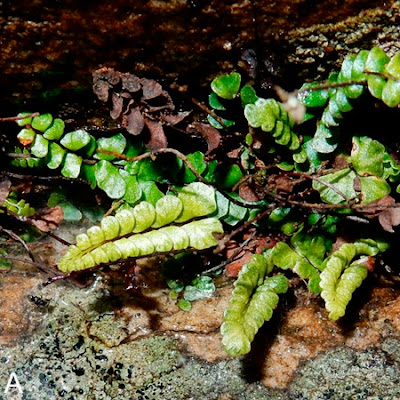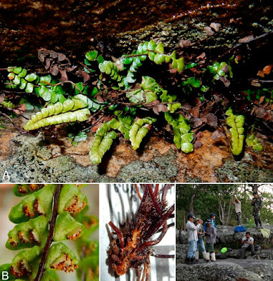 Asplenium minutifolium Kanem. & Tagane, sp. nov. Similar to Asplenium kiangsuense Ching & Y.X.Jing of southern China in size and shape of lamina, but differs in having a narrower lamina (ca 0.7 cm wide in A. minutifolium vs. ca 1 cm wide in A. kiangsuense), wingless rachis (vs. 2 slightly raised lateral wings), smaller pinnae (1–4 × 0.8–2.5 mm vs. 4–5 × 4–5 mm), generally fewer sori per pinna (1– 3(–4) vs. 3–5), and in the sori arrangement (usually arranged in a row vs. arranged oppositely). Also similar to Asplenium siamense Tagawa & K.Iwats. of North-East Thailand, but can be distinguished by its simple pinnae at the tip of lamina (vs. lamina forked several times at the tip), thicker pinnae (thickly papery vs. thinly papery), reflexed pinna arrangement in lower part (vs. divaricate around lamina), and pinnae with entire or slightly undulate margins (vs. shallowly lobed (lobes to ca 1mm long)). –– Type: Thailand. Loei Province, Phu Kradueng National Park, Lom Sak Cliff, alt. 1292 m, 12 June 2015, Kanemitsu et al. T4736 (holotype BKF!, isotype TNS!). Distribution.–– Currently Asplenium minutifolium is known only from Phu Kradueng National Park and Khao Yai National Park. Ecology.–– In Phu Kradueng National Park, Asplenium minutifolium occurs in a semi-shaded and damp rock crevice that is ca 50 cm wide and 10 cm deep, on the plateau at an altitude of ca 1300 m. Associated fern and lycophyte species include Aglaomorpha rigidula (Sw.) Hovenkamp & S.Linds., Goniophlebium subauriculatum (Blume) C.Presl, Oleandra undulata (Willd.) Ching, Pyrrosia lingua (Thunb.) Farw. var. heteractis (Mett. ex Kuhn) Hovenkamp, and Selaginella siamensis Hieron. Other than the elevation, nothing is known about the ecology of this species at Khao Yai National Park. Etymology.–– The species epithet “minutifolium” refers to the very small lamina and pinnae of this species. Hironobu Kanemitsu, Shuichiro Tagane, Somran Suddee, Sukid Ruangruaea, Tetsukazu Yahara. 2017. Asplenium minutifolium (Aspleniaceae), A New Species from Thailand. THAI FOREST BULL., BOT. 45(1); 29–34. DOI: 10.20531/tfb.2017.45.1.06 ![]() |