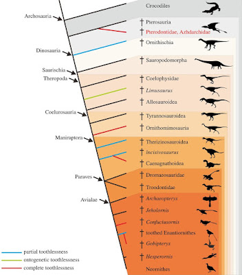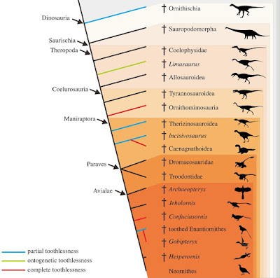 | Figure 1. Toothlessness in dinosaurs. Consensus cladogram of Archosauria shows that edentulism frequently evolved independently in several lineages. All Ornithischia, Therizinosauroidea, Incisivosaurus and toothed Enantiornithes exhibit partial tooth loss. Ontogenetic edentulism has been reported for the theropod Limusaurus from China [Wang et al., 2017]. Complete edentulism is observed in some pterosaurs, Ornithomimosauria, Caenagnathoidea (including Oviraptoridae), some Mesozoic birds such as Confuciusornis and Gobipteryx, and all extant birds (Neornithes).