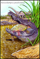 Conclusions: The enigmatic taxon “Goniopholis” paulistanus was reanalyzed in the light of new material collected from the uppermost sequence of the Presidente Prudente Formation in Alfredo Marcondes municipality, Early Maastrichtian, correlated level in the Adamantina Formation first record of Valparaíso and Mirandópolis regions, allowing us to validate the species in a new taxonomic combination Roxochampsa paulistanus. Based on the dubious nature of Goniopholis occurrences in South America, and the disparity in mandibular morphology between Goniopholididae and this species, the new genus Roxochampsa is here proposed. The new material reveals another tooth morphology present in the Bauru Group, just only verified for Roxochampsa paulistanus and the thalattosuchians teleosaurids: Machimosaurus hugii and M. rex, in which the tooth crown exhibits the main carinae and additionally secondary ones (high relief apicobasal ridges) crenulated by pseudo-denticles. However, the morphological tooth similarities among itasuchids with some neosuchians as goniopholids and some teleosaurids, it reveals a pattern of dental convergence within Mesoeucrocodylia, that lacks a phylogenetic signal. In our cladistic analysis Roxochampsa paulistanus was recovered in the node Itasuchidae, being closed related to Caririsuchus, Itasuchus, and Pepesuchus. This clade is nested within Sebecia, which is here founded to be the major sister group to Notosuchia, both composing a more inclusive clade Ziphosuchia. Thus, the neocretacic mesoeucrocodylian fauna for South America was formed by terrestrialized and continental semi-aquatic forms from two distinct clades: notosuchians, well-adapted for terrestrial niches (e.g. Uruguaysuchidae, Sphagesauridae, Baurusuchidae), and sebecians as more generic forms that included numerous reversions to an semiaquatic lifestyle (e.g. itasuchids, Stolokrosuchus, Mahajangasuchus and Lorosuchus). In accordance with previous works, we found many homoplastic characters for Crocodyliformes, which could imply a mosaic evolutionary pattern, heavily influenced by the ancestral crocodyliform bauplan. André E. Piacentini Pinheiro , Paulo Victor Luiz Gomes da Costa Pereira, Rafael G. de Souza, Arthur S. Brum, Ricardo T. Lopes, Alessandra S. Machado, Lílian P. Bergqvist and Felipe M. Simbras. 2018. Reassessment of the Enigmatic Crocodyliform "Goniopholis" paulistanus Roxo, 1936: Historical Approach, Systematic, and Description by New Materials. PLoS ONE. 13(8): e0199984. DOI: 10.1371/journal.pone.0199984 |