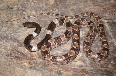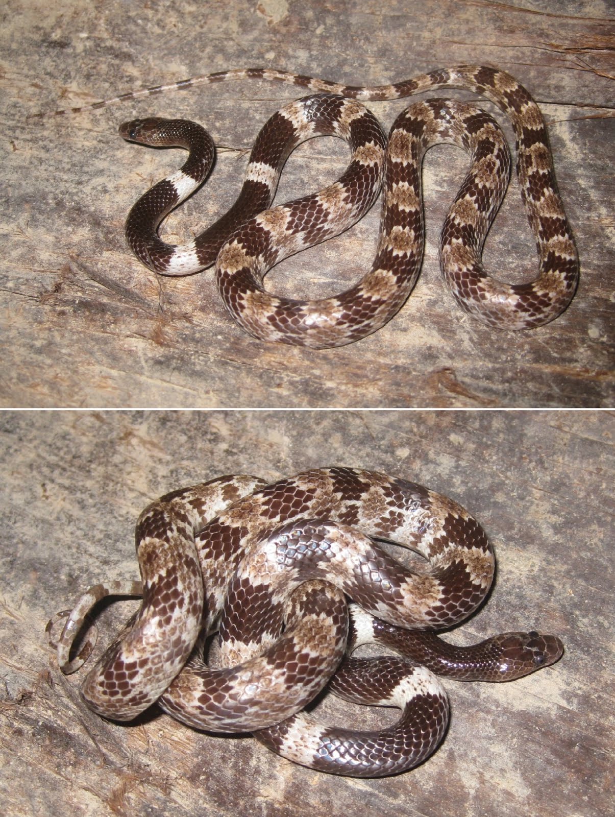 Lycodon pictus sp. nov. Diagnosis: Lycodon pictus sp. nov. can be differentiated from its congeners by the following morphological characters: dorsal scales in 17–17–15 rows, all smooth; supralabials usually eight (rarely nine); infralabials ten; one elongated loreal on each side, in contact with the eye; precloacal plate single; ventral scales 212–218 (plus one or two preventral scales); subcaudals 90 or 91; a total length of 597+ mm in males and 543 mm in females; tail / total length ratio 0.211–0.215; maxillary teeth 13 or 14; dorsal surface of body with 28 or 29 light body bands; dorsal surface of tail with 13 cream bands forming a distinct blotch in the vertebral region; ventral surface of body and tail mostly cream with the dark body bands in part extending towards the venter, sometimes forming complete dark bands around the body. ...