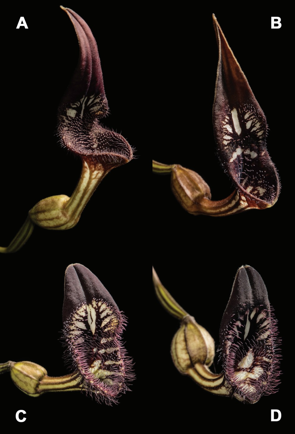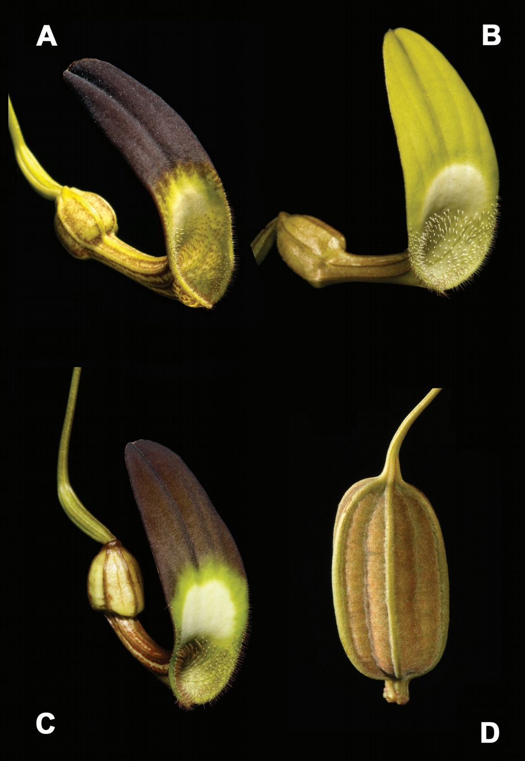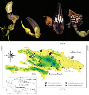[Botany • 2019] Aristolochia (Aristolochiaceae) of Hispaniola Abstract A review of the literature at large and the field photographic record of the senior author of this study indicate that there are several undescribed species of Aristolochia in Hispaniola (Dominican Republic and Haiti), related to A. bilobata. Here we show that A. mirandae is a synonym of A. bilobata and that what appears as A. bilobata in Marión H. (2011: 76–77) is a new species here described as Aristolochia adiastola. In addition, two new species, A. bonettiana and A. marioniana, also related to A. bilobata, are described and illustrated herein. Key words: Aristolochia, Aristolochiaceae, hexandrous, West Indies Aristolochia adiastola G.A. Romero & E. Fernández, sp. nov. Aristolochia adiastola differs from A. bilobata by the absence of a constriction between the limb and the tube, the color of the limb (purple to brown with white spots in the new species versus greenish to yellowish with purple veins in A. bilobata), the orientation of the flowers, and their allopatric distribution. Etymology:— From the Greek ἁδιαστολή, adiastolos, “not separated, confused” (Brown 1954: 228). An examination of herbarium specimens from A, GH, JBSD, NY, US, and USD (herbarium acronyms cited according to Thiers, continuously updated), filed under Aristolochia bilobata, as well as a search of images on the Internet under “Aristolochia bilobata”, revealed a mixture of A. adiastola, A. bilobata, and several undescribed species. This confusion can be traced back to the fact that A. bilobata was thought not to have any close relatives (Rankin and Greuter 1999) and that “while this species was frequently collected without flowers or fruits, it could be readily identified by the curious bilobate leaves” (Pfeifer 1966). Following these criteria, all plants from Hispaniola bearing bilobate leaves were at first identified, albeit often incorrectly, as A. bilobata. As pointed out above, in vivo, Aristolochia adiastola can be easily distinguished from A. bilobata based on the color and orientation of the flowers (Fig. 4). Regarding orientation, the utricle is always pendant and the tube horizontal to pendant in A. adiastola; the former is always horizontal, and the latter erect in A. bilobata. Flower buds of A. adiastola start with the largest medial lobe abaxial (“1” in Pfeifer 1966: figure 2 therein; “a” in González 1999: 54, figure 12 therein); a flexure downward and a twist in the peduncle make the ovary and utricle pendant, and a slight bending upward of the tube relative to the utricle makes the tube horizontal to pendant and the medial lobe of the calyx adaxial and vertical (Figs. 3, 4). It is not clear whether the “twist” mentioned above always occurs in the peduncle: it is sometimes evident in the ovary (Fig. 4B, C). Flowers of his species change shape in function of their development. At anthesis, early in the day, the edges of the limb are not revolute (Fig. 4B); by noon the edges are conspicuously revolute (Fig. 4A, B, C; in the afternoon, the edges of the limb bent forward, as the flower becomes senescent. The white spots on the limb of flowers of the new species vary from inconspicuous, small, to conspicuous, horizontal to transversal, white spots. Likewise, the density and length of the multicellular trichomes along the basal margin of the limb also vary considerably (Fig. 3). A collaborator of the senior author recently found a population of A. adiastola the plants of which bore totally green flowers, with subtle lighter green spots at the base of the limb (Fig. 4D). The specimen collected by O. P. Swartz at SBT (11433, Ex Ind. Occident., as “Aristolochia bilobata Linn.” [image seen]) has two deteriorated flowers that yet show somewhat the limb shape of A. adiastola but, according to the senior author of this contribution, it may be referable to an undescribed species from Haiti. Two other specimens attributed to Swartz and identified as A. bilobata, one at B (B-W 17050-01 0 [image seen]), with one deteriorated, undeterminable flower and a fragment of another one in the convolute, based on its size possibly belonging to another species, and one at S (08-1029 [image seen]) bears leaves only; another one at S [08-1032 [image seen]) bears only leaves and a fruit (with seeds in the packet). Field and herbarium diagnostic characters:— In vivo, at anthesis, utricle pendant, tube horizontal to pendant, limb erect, purple to brownish red with white spots of variable size, without a constriction, the margins revolute at late anthesis. Flowers in herbarium specimens may conserve the original color, or the flower color may be cited in the label and, if mature flowers are present, the limb without constriction is easily discernable. Ultimately, herbarium specimens of the new species with accurate locality can be easily distinguished from A. bilobata because of the strictly allopatric distribution of these two species (Fig. 5). Aristolochia bonettiana E. Fernández & G.A. Romero, sp. nov. Aristolochia bonettiana differs from A. bilobata by the absence of a constriction between the limb and the tube, the color of the limb (brown at the terminal end and greenish yellow at the base with central whitish patch at base versus greenish to yellowish with purple veins in A. bilobata), and their allopatric distribution. Etymology:— In honor of Rosa Margarita Bonetti, president of Fundación Propa-gas and a sponsor of Aristolochia research in the Dominican Republic. Field and herbarium diagnostic characters:— In vivo, at anthesis, utricle pendant, tube horizontal to pendant, limb erect, brown at the terminal end and greenish yellow at the base with a whitish central patch, without a constriction, the margins revolute at late anthesis. Some individuals manifest an absence of brown at the terminal end of the limb (Fig. 10B). At anthesis, the flowers present a strong scent of lemongrass. Flowers in herbariu
