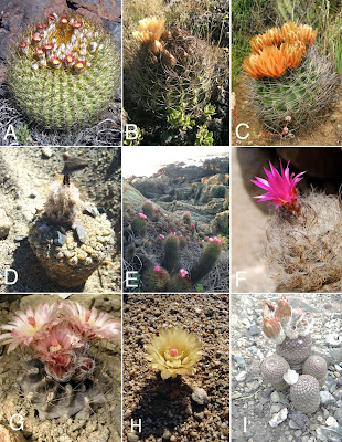 | Fig. 1. Diversity and morphology of some of the Eriosyce species included in the molecular analyses. A, Eriosyce aurata; B, E. marksiana var. lissocarpa; C, E. curvispina; D, E. krausii; E, E. subgibbosa; F, E. senilis subsp. elquiensis; G, E. crispa; H, E. odieri subsp. malleolata (=E. malleolata); I, E. napina subsp. duripulpa (= E. duripulpa).