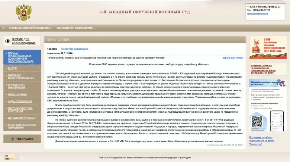 Российский суд впервые признал, что по крейсеру Москва ударили украинские ракеты, но потом удалил но Posted by: serhiollll 23 января 2026, 15:14  Согласно информации, опубликованной на сайте 2-го Западного окружного военного суда, 14 апреля 2022 года ГРКР Москва был поврежден двумя ракетами, в результате чего погибло 20 членов экипажа, пропало без вести 8, еще 4 пострадали, а сам крейсер спасти не удалось. Виновным за это признан Андрей Шубин, командир 406 отдельной артиллерийской бригады ВМСУ, на вооружении которой стоят береговые ракетные комплексы РК-360МЦ Нептун. Кроме того, Шубин признан виновным и нанесении ракетного удара по фрегату Адмирал Эссен проекта 11356Р, в результате чего ранение получил один из членов экипажа. 2-й Западный окружной военный суд заочно постановил приговор в отношении командира войсковой части А-2062 - 406 отдельной артиллерийской бригады военно-морских сил вооруженных сил Украины Андрея Шубина , отдавшего 2 и 13 апреля 2022 года приказы своим починенным нанести ракетные удары по фрегату Адмирал Эссен гвардейскому ракетному крейсеру Москва, выполнявшим в нейтральных водах Черного моря гуманитарные задачи по обеспечению безопасности прохода гражданских судов и охране газодобывающей установки "Одесское". В результате ракетного удара 2 апреля 2022 г. был поврежден по фрегат "Адмирал Эссен" и ранен один из членов экипажа этого корабля, а 13 апреля 2022 г. - ракетный удар двумя ракетами по гвардейскому ракетному крейсеру Москва, от взрыва которых на судне развился пожар с задымлением внутренних помещений. От взрыва, пожара и дыма погибло 20 членов экипажа крейсера, двадцати четырем членам экипажа были причинены телесные повреждения различной степени тяжести, а восемь человек - пропали без вести, в том числе в ходе борьбы за живучесть корабля, длившейся свыше шести часов. Вместе с тем, аварийной команде и остальным членам экипажа не удалось спасти гвардейский ракетный крейсер Москва, и он погиб вместе с имевшимися на нём материальными средствами. Указанные корабли и члены их экипажей в СВО задействованы не были. В ходе судебного следствия были исследованы показания выживших членов экипажей и родственников погибших, один из которых был допрошен в суде, изучена служебная документация и результаты множества экспертиз, заслушан представитель Министерства обороны Российской Федерации, обосновавшего и поддержавшего исковое заявление данного ведомства. В частности, было исследовано интервью командующего военно-морскими силами Украины, подтвердившим факт нанесения ракетного удара по гвардейскому ракетному крейсеру Москва. По итогам судебного разбирательства суд пришел к выводу о доказанности вины Шубина в совершении преступления, предусмотренного ч. 3 ст. 361 УК РФ - совершении вне пределов территории Российской Федерации взрывов и поджога, подвергающих опасности жизнь, здоровье, и неприкосновенность граждан Российской Федерации в целях нарушения мирного сосуществования государств и народов, направленных против интересов Российской Федерации, повлекшие смерть человека, то есть в совершении акта международного терроризма, и назначил ему наказание в виде пожизненного лишения свободы с отбыванием первых 10 лет в тюрьме, а остальной части наказания - в исправительной колонии особого режима. Также по делу постановлено взыскать Шубина 