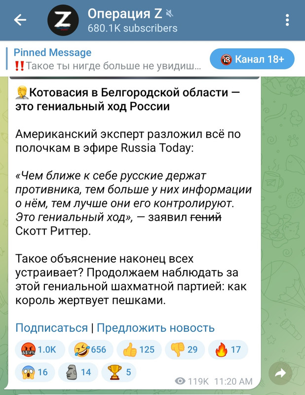 Анал и теги в гомунку Posted by: tolya99 ????Котовасия в Белгородской области — это гениальный ход России Американский эксперт разложил всё по полочкам в эфире Russia Today: «Чем ближе к себе русские держат противника, тем больше у них информации о нём, тем лучше они его контролируют. Это гениальный ход», — заявил гений Скотт Риттер. Такое объяснение наконец всех устраивает? Продолжаем наблюдать за этой гениальной шахматной партией: как король жертвует пешками.