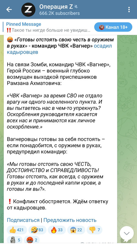 Жабогадюкинг заказывали? Делайте ваши ставки господа! Posted by: tolya99❗️Пригожин VS Кадыров: представители Главы Чечни наехали на Пригожина Глава парламента Чечни Магомед Даудов – Пригожина считает паникером: «У наших бойцов тоже были проблемы, но это не значит, что воин должен об этом кричать. В своих заявлениях ты всегда намекаешь, что кого-то надо расстрелять. За такие слова во Вторую мировую войну сразу поставили бы к стенке. Не забывай, Женя, благодаря кому у тебя частная военная компания» А правая рука Рамзана Кадырова Адам Делимханов и вовсе вызвал Евгения Викторовича на стрелку: «Мы все знаем сколько людей ты положил в направлении Бахмута за 8 месяцев. Хватит тебе болтать и кричать, говори место и время и мы встретимся» Главный оркестрант уже ответил соратникам Кадырова. Если коротко, власть критиковать Пригожин не прекратит, а если надо разобраться – цифры знаете, наберёте: «...что касается моего местоположения. То все участники этой дискуссии прекрасно знают мои в том числе закрытые специальные телефоны и имеют возможность со мной связаться». Пригожин Бахмут хотя-бы взял, это факт. Снова стычки на пустом месте, нет бы работать сообща ????????♂️ https://t.me/c/1552544518/17268 ------------------------- ???? «Готовы отстоять свою честь в оружием в руках» - командир ЧВК «Вагнер» осадил кадыровцев На связи Зомби, командир ЧВК «Вагнер», Герой России – военный глубоко возмущен выходкой приспешников Рамзана Ахматовича: «ЧВК «Вагнер» за время СВО не отдало врагу ни одного населенного пункта. И вы пытаетесь нас в чем-то упрекнуть? Оскорбления руководителя касается всех нас и принимаются как личное оскорбление.» Вагнеровцы готовы за себя постоять – если понадобится, с оружием в руках, предупредил командир: «Мы готовы отстоять свою ЧЕСТЬ, ДОСТОИНСТВО и СПРАВЕДЛИВОСТЬ! Готовы отстоять, как всегда, с оружием в руках и до последней капли крови, а готовы ли вы?». ❗️Конфликт обостряется. Ждём ответку от кадыровцев. https://t.me/c/1552544518/17285    comments |