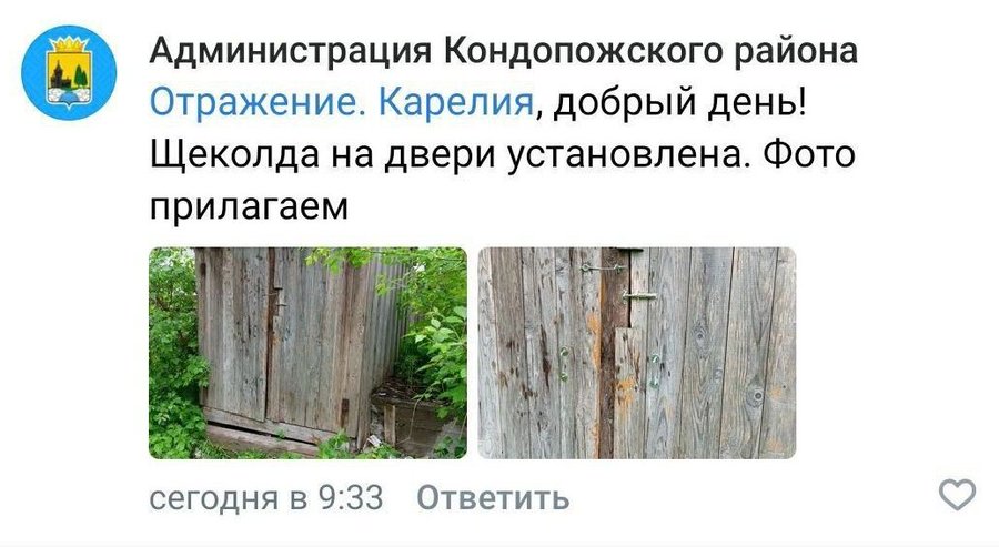 Кондожопа Posted by: serhiollll Администрация Кондопожского района установила щеколду на деревянный туалет у одного из городских бараков и отчиталась об этом в соцсетях.  comments | 8:33a |