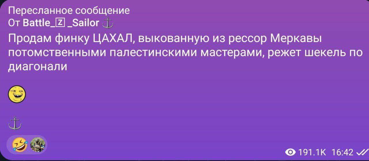 Ой Posted by: tolya99 ‼️ ХАМАС заявил, что Россия финансирует их нападение на Израиль Представитель боевиков в интервью CNN признался, что организация получила поддержку от РФ в день атаки, 7 октября: "Россия нам симпатизирует. Русские прислали нам сообщения [в субботу] утром. Есть сочувствие. Там рады, что Америка застрянет в Палестине. Это снижает давление на Москву по вопросу войны в Украине. Одна битва облегчает другую битву. Поэтому мы не одни на поле битвы". ХАМАСовцы утверждают, что Россия помогает им деньгами, по оружию он не уточнил. Будем честны, нам и правда очень кстати открытие второго фронта против США ???? https://t.me/c/1552544518/24845 (каналья закрытая?)  comments | 12:35p |