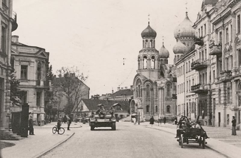 По улице Большая Погулянка идет колонна немецких войск, судя по технике это самое начало войны, немецкий солдат выглядывает из кузова грузовика. Он видит красивую церковь, достает фотоаппарат, и уже проезжая, в последний момент, успевает сделать снимок.
