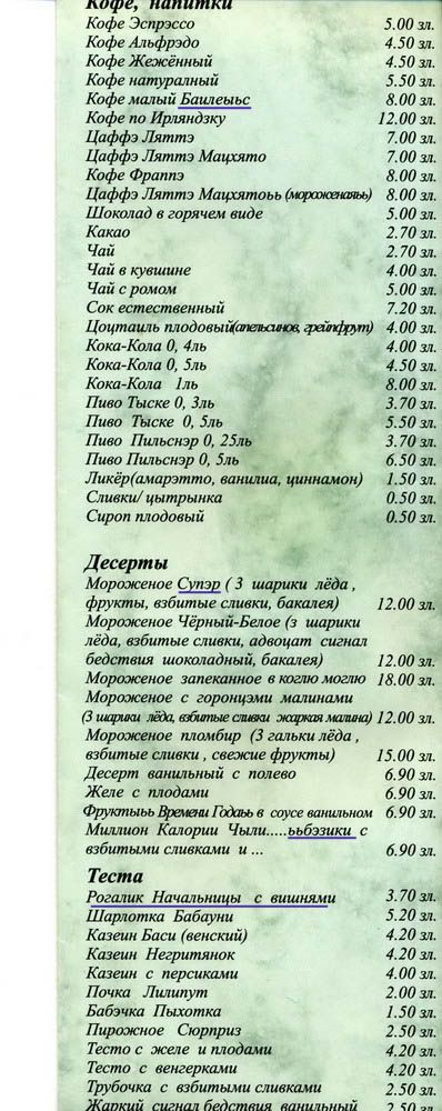 и снова меню это будет мой дебют в данном сообществе не как посетителя, а как.. гм. помидорами не кидаться) в общем, дело было ещё в сентябре, ехали мы в польский город Горжув (или ГоржуФ... честно, не могу сказать точнее))) ... это от нас километров 400. остановились перекусить в местечке, известном в народе как "Лебеди". потому что там заправка, кафешка и зоопарк. пошли, значит, мы перекусить. там меню лежат на трёх или четырёх языках. польском, немецком, английском и русском. мы взяли русское и пошли читать...