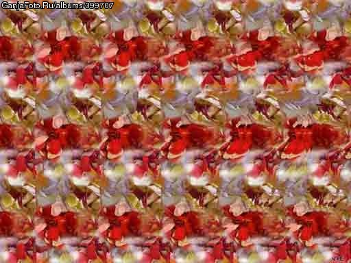 Стереограммы Вот вам подборка несложных стереограмм... Увлекателько)) Для тех, кто не в теме: Стереограмма (Stereogramm, Magic Eye) представляет собой трехмерное изображение, которое при рассматривании картинки обычным образом обнаружить не удается. Для того, чтобы настроить глаз на трехмерную картинку с потрясающим реализмом глубины пространства, можно использовать несколько приемов: либо смотреть как бы "сквозь фон" изображения в бесконечность, либо найти два симметричных фрагмента картинки и попытаться соответствующим поворотом глазных осей совместить эти фрагменты, либо приблизить глаза на расстояние около 15 см от изображения и затем постепенно отдаляться. При соответствующей "настройке" зрительного аппарата изображение можно увидеть даже на расстоянии нескольких метров от экрана. В зависимости от индивидуальных особенностей зрения человека (и прежде всего психологического восприятия изображений) трехмерный эффект может быть разным для разных изображений: обычно картинки, содержащие четко видимые симметричные фрагменты, распознаются легче. Наконец, следует отметить, что изображение обычно не воспринимается, если смотреть на картинку сбоку, и (таков уж алгоритм его формирования) в общем случае является только контурным. Около 2% населения Земли физически неспособно увидеть скрытое изображение на стереограмме из-за особенностей зрения. Еще 30% столкнутся с трудностями в этом сложном деле, но в действительности для них нет никаких препятствий. Остальные 68% вообще не должны жаловаться на проблемы, и после пары-тройки тренировочных просмотров все у них пойдет как по маслу. 1. ![]() 2. ![]() ... ![]() 3. ![]() 4. ![]() 5. ![]() 6. ![]() 7. ![]() 8. ![]() 9. ![]() 10. ![]() 11. ![]() 12. ![]() 13. ![]() 14. ![]() 15. ![]() 16. ![]() 17. ![]() 18. ![]() 19. ![]() 20. ![]() 21. ![]() 22. ![]() 23. ![]() 24. ![]() 25. ![]() 26. ![]() 27. ![]() 28. ![]() 29. ![]() 30. ![]() 31. ![]() 32. (для мальчиков)) ![]() 33. ![]() 34. ![]() 35. ![]() 36. ![]() 37. ![]() 38. ![]() 39. 40. ![]() 41. ![]() 42. ![]() Пишите какие больше всего понравились... и вообще кто что видит. про создание стереограмм: http://www.3dmaxfido.info/7/