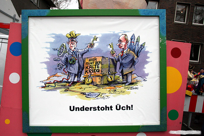 Путин, Буш, Медведев на карнавале в Кельне ![]() ... Среди международных политических тем в центре внимания Кельнского карнавала в этом году - защита земного климата, борьба за Северный полюс и Россия. Владимира Владимировича удалось обнаружить сразу на двух тематических повозках, а также на одном плакате. Шествие сегодня проходит под дождем. Хороших фотографий получилось мало. Справедливости ради отмечу, что немецким политикам тоже досталось по полной программе. Может быть, выложу несколько фотографий позже. "Конец Черного Лорда". Гарри Поттер против Буша ![]() "Здесь покоится холодная война" "Договоритесь!" ![]() "Демократический наследник Путина" "Права человека" ![]() "Медведев" ![]() "Газпром" ![]() "Путин" ![]() "Северный полюс" UPD. Министр внутренних дел Германии Шойбле следит за добропорядочными бюргерами. Интимные подробности