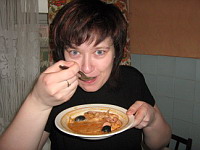Взобравшись на 4-й этаж, обменявшись подарками и переодевшись, мы обнаружили на кухне бутылку Крымского шампанского, пару бутылок "Бiла нiч", две коробки конфет и потрясающие колбаски с тушёной капустой. Стало окончательно ясно, что про диету в ближайшие два дня можно не вспоминать.