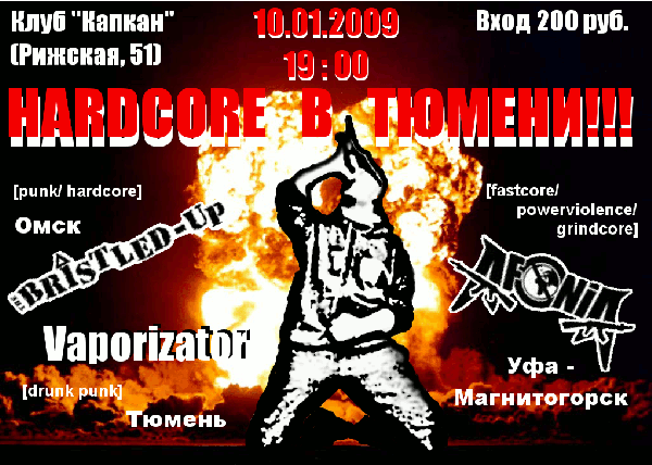 12:49 am - Хардкор в Тюмени Мы тут концерт устраиваем 10 января. Можно сказать, первый (или один из первых) хардкор-сейшенов в нашем прекрасном городе. Приедут команды из Омска (Bristled-Up) и Уфы/Магнитогорска (Afonia), и ещё выступит тюменский Vaporizator. Первые две команды довольно левацки ориентированные, тюменцы относительно аполитичные. Всё это безобразие будет иметь место в баре “Капкан” (Рижская, 51) 10 января в семь часов вечера. Послушать жёсткую музыку и поколбаситься можно будет всего за 200 рублей. Так что любители хардкора, панка и всего такого - welcome. Занесите себе в календари и не пропустите. Страничка концерта на last.fm