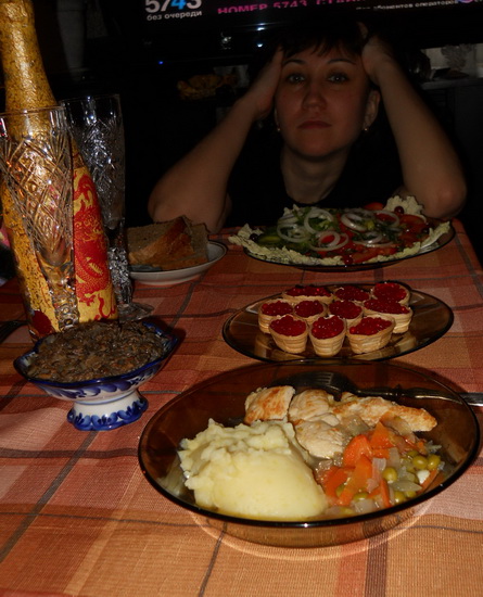 Тушёный страус по-домашнему, с овощами ..К возвращению Натальи замутил небольшой расово правильный праздничный стол: ![]() 1. Мало кто знает, но в Лосинке филе страуса можно купить всего за 160 RUR/кг - сказывают, что в подмосковье успешно работает птицеферма, где их выращивают. По вкусу это зачётнейшее лакомство напоминает индейку, но гораздо нежнее и быстрее в приготовлении. Итак, берём: - филе страуса (1 кг); - морковь, горох, репчатый лук, помидор. Можно ещё добавить картошку - но я не стал, приготовив отдельно картофельное пюре; - чёрный перец, соль, зелень. Слегка обжариваем мясо, затем перекладываем всё в кастрюлю, где уже имеюцца порезанные овощи, добавляем воды и варим всю эту хрень не более 20-30 минут - страус готовится быстро. 2. Про остальное и рассказывать ничего не нужно: это банальный овощной зелёный салат с добавлением лимона и клюквы, а также аккуратно выложенная в тарталетки со сливочным маслом красная икра. Ну и ещё пара штрихов: ![]() ![]() |