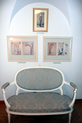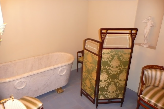 Здесь же потайная дверь в хранилище драгоценностей и лесенка наверх в Студию (рисовальную комнату Ирины). Там работал коллектив художников, и сейчас развернута посвященная им экспозиция. Вот фотографии творческих единомышленников молодого князя Другая дверь из спальной ведет в ванную комнату (реконструирована) ![]() В ней еще есть ваза, рядом – симпатичный туалет