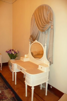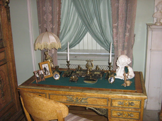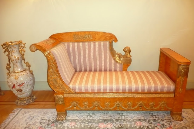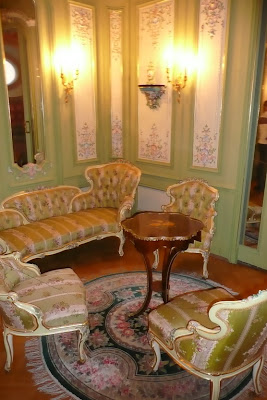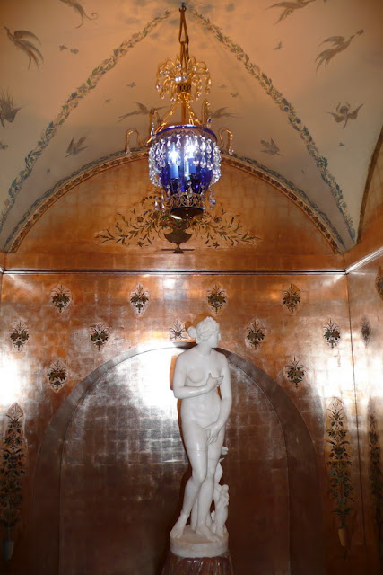 За нею находились помещения зимнего сада и курительной. Сейчас здесь часть экспозиции из Казани, повествующей о роде Юсуповых от Юсуф-мурзы до героя нашего рассказа Еще два снимка интерьеров помещений, примыкающих к танцевальному залу Часть интерьеров уходила в глубину участка. «Во дворе были часовня и наши собственные апартаменты: спальня и будуар Ирины выходили на юг, мозаичный бассейн и маленькая гардеробная… с витринами для драгоценностей Ирины». Это Малая гостиная (будуар Ирины Александровны) ![]() Ее альковная часть с изысканной отделкой сусальным серебром именуется Серебряным будуаром ![]() Покрытие серебра, к сожалению, со временем приобрело медный оттенок. В полуциркульных нишах будуара были выполнены фонтаны слез с чашами из полудрагоценных камней. Интерьеры Малой гостиной Отсюда можно пройти в Спальную комнату. В ее большой альковной части кровать и ночные столики
