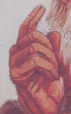 Качество не очень, но лично я там вижу плохо прорисованные кончики двух пальцев. Все, кому я показывал эту красоту живьём, соглашаются, что он шестипалый.